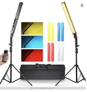 Angler Bi-Color Ring Light Kit with Light Stand (18″). I have this ring light and use it for my auditions at home. It is excellent but it needs supplemental lights. I am getting the light stick kit in the next box over to see if they help with shadows on the wall behind me.