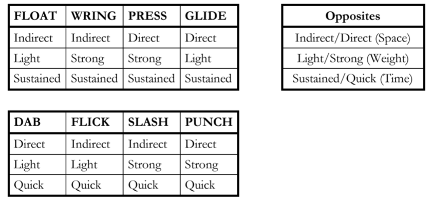 After we’ve experienced the six different types of movement, we begin working with an Effort Shape. Each Effort Shape is a combination of three of the six movement qualities. Wring is indirect, strong, and sustained. Press is direct, strong, and sustained. Flick is indirect, light, and quick, and so on. (See the chart below for the full Effort Shapes.)