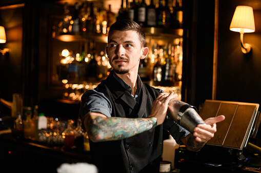 Here you could step just into frame, say camera right. Look around for Clover, spot her camera left, give a slight nod to the bartender (camera right) and take a step or so in so you’re in the center of the frame and then sit down on a raised stool (so whoever is filming you doesn’t have to pan down) and then start your lines to Clover.
